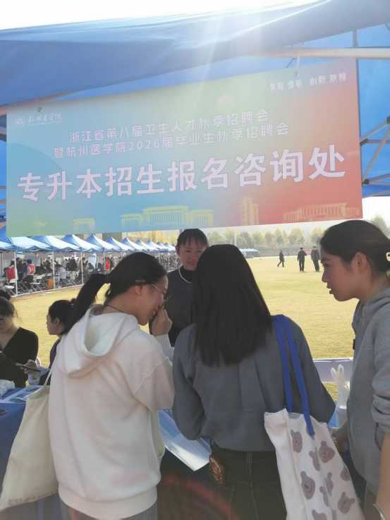 11月16日,浙江省第八届卫生人才秋季招聘会暨杭州医学院2026届毕业生秋季招聘会在学校临安校区顺利举行。招聘会现场人头攒动,气氛热烈,不仅为毕业生提供了丰富的就业机会,也成为杭州医学院继续教育学院开展高等学历继续教育专升本招生宣传的重要平台。 借助此次招聘会的广泛影响力,继续教育学院在会场专门设立了“专升本招生报名咨询处”,积极面向参会学生及社会考生开展招生宣传和答疑服务。咨询现场互动频繁,工作人员围绕学子最关心的问题耐心答疑:从“继续教育专升本与全日制专升本的学历性质差异”,到“报考条件、报名时间节点”,再到“证书效力、线上线下结合的学习形式”,逐一拆解信息盲点。许多应届毕业生和在职人员对继续教育专升本表现出浓厚兴趣。部分考生在了解相关政策后,当场加入招生钉钉群,以便及时获取最新招生动态和备考资源。继续教育学院将持续为意向考生提供在线咨询服务,并通过我校高等学历继续教育智慧服务平台免费提供考前辅导,全力支持考生备考。 此次招生宣传是继续教育学院主动融入学校大服务工作、拓展生源渠道的有效举措。学院将不断优化招生服务模式,提升教育服务质量,为构建终身学习体系、培养地方人才贡献力量。  (文/程凌、初审/占洁、终审/蒋锦琴)