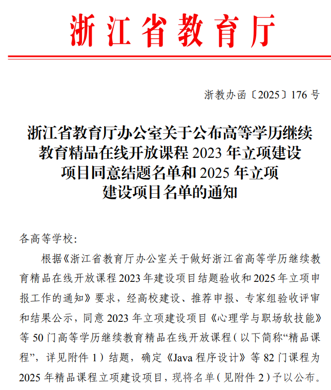 根据《浙江省教育厅办公室关于做好浙江省高等学历继续教 育精品在线开放课程2023年建设项目结题验收和2025年立项申报工作的通知》(浙教办函〔2025〕131 号)要求,经我校老师自主申报、继续教育学院组织校外专家评审、省教育厅组织专家评议遴选等环节,近日,浙江省教育厅公布了《浙江省教育厅办公室关于公布高等学历继续教育精品在线开放课程2023年立项建设项目同意结题名单和2025年立项建设项目名单的通知》(浙教办函〔2025〕176号),我校成果丰硕:方雅青老师《医学信息检索与利用》、李光兰老师《外科护理学》在申报中脱颖而出,入选2025年立项建设项目,申报成功率100%;王家学老师主持的2023年立项课程《临床微生物学检验技术》顺利通过验收结题。立项与结题同步丰收,标志着我校高等学历继续教育课程建设质量与内涵发展再上新台阶。