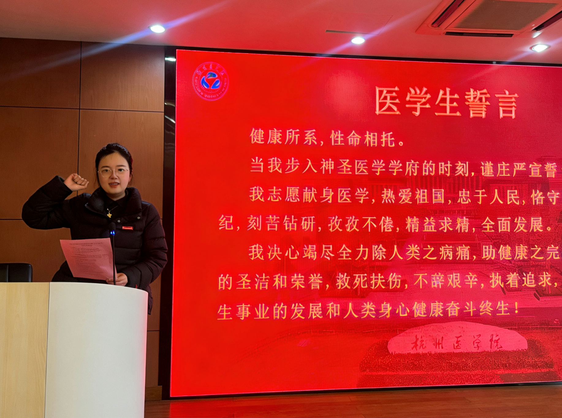 随后,教务处继续教育管理办公室主任杨颖带领现场及线上全体新生进行医学生宣誓,铿锵的誓言透过屏幕回荡在各个观看点位,彰显着全体新生恪守医德、精医报国的坚定信念。