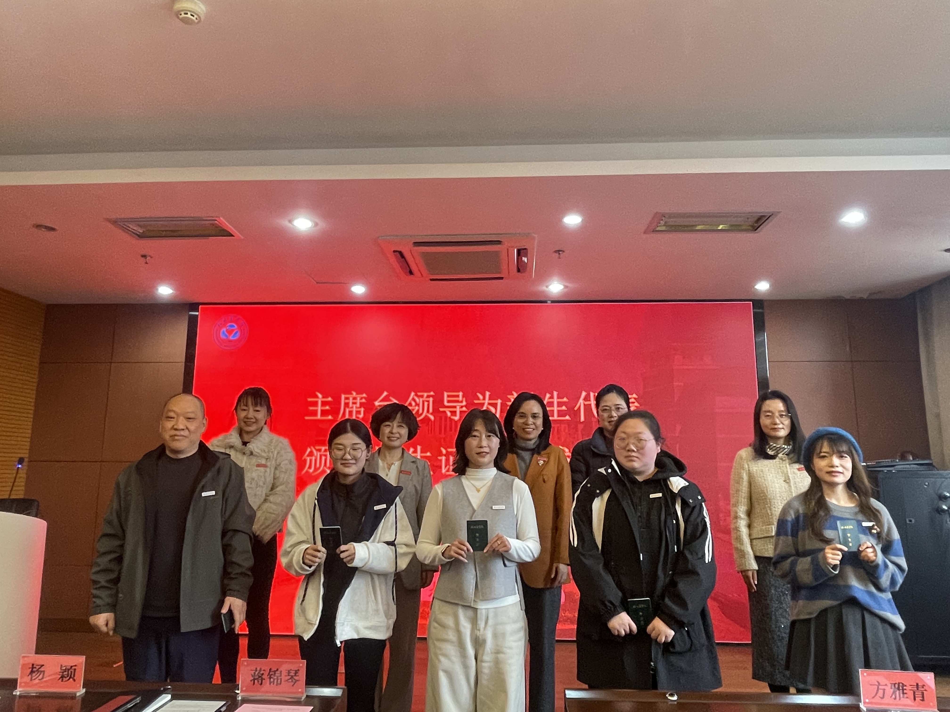 主席台领导为现场新生代表颁发学生证并佩戴校徽,一枚枚校徽承载着杭医的精神与期望,也标志着全体新生正式成为杭医大家庭的一员。